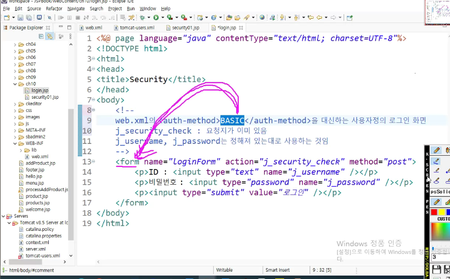 wb.xml의 <auth-method>BASIC</auth-method>을 대신하는 사용자정의 로그인 화면