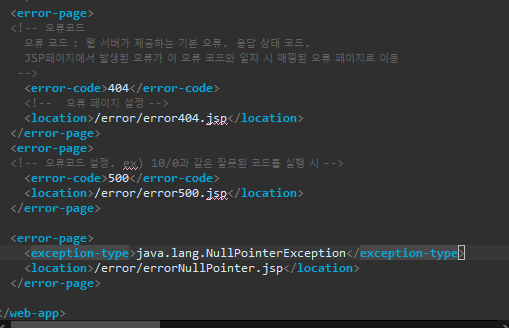 JSP페이지에서 발생된 오류가 이 오류 코드와 일치 시 매핑된 오류 페이지로 이동