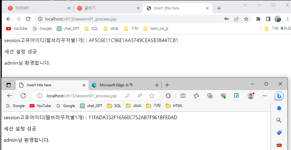 out.print("session고유아이디(웹브라우저별1개) : " + session.getId() + "<br />");