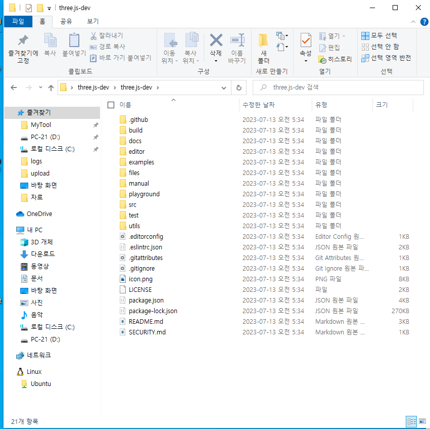 다운받은 three.dev 압축 풀기