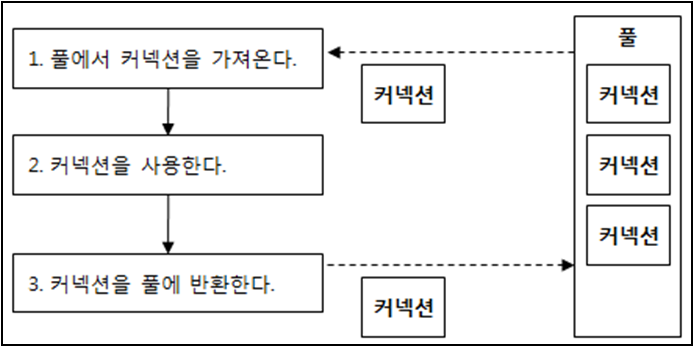 데이터베이스와 연결된 커넥션을 미리 만들어 풀(pool)속에 저장해 두고 있다가 필요할 때에 커넥션을