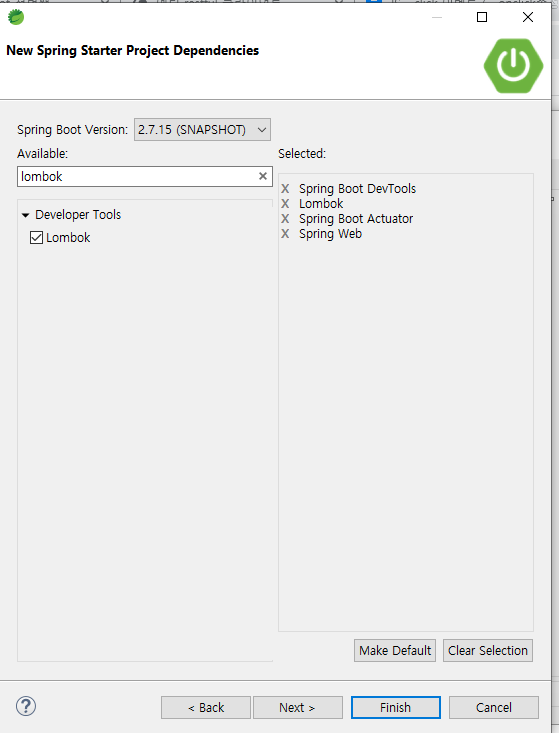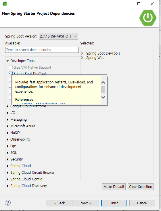 지우고 Delveloper Tools에서 Spring Boot DevTools 체크