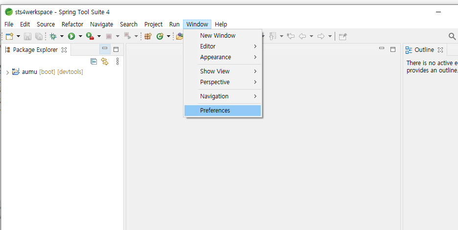 이화면 나옴 여기서 윈도우 프리퍼런스 선택