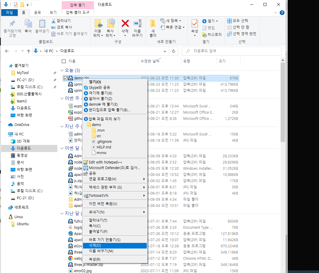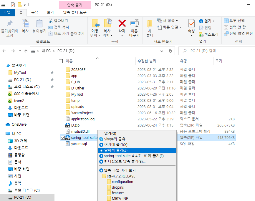 이건 첫번째 다운받은 파일인데 다운로드 받은파일 D드라이브로 옮김