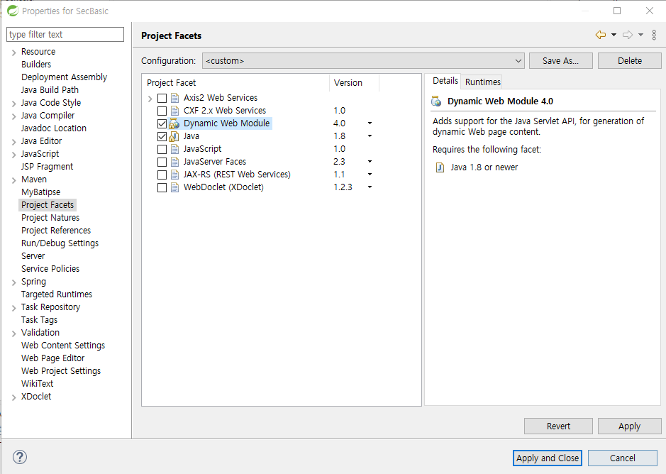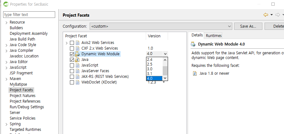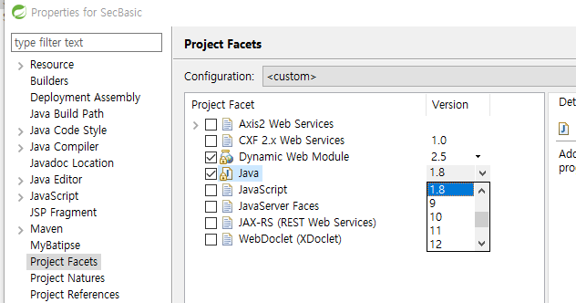 Project Facets 선택해서 java파일 내 버전으로 설정