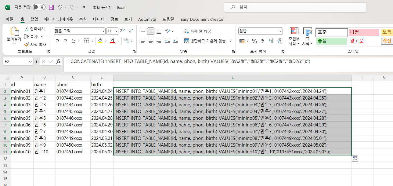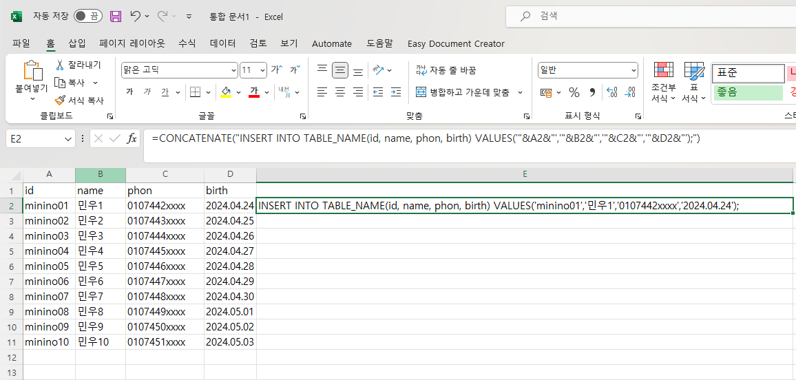 =CONCATENATE("INSERT INTO TABLE_NAME(id, name, phon, birth)