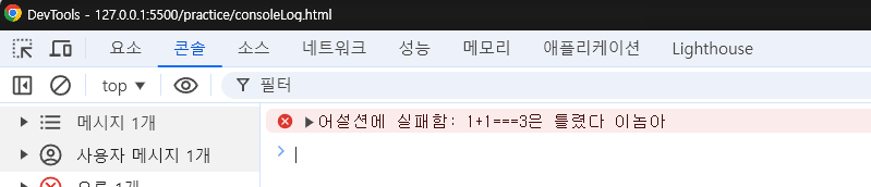 사용문법 : console.assert("조건문", "틀렷을때 출력될 인자")