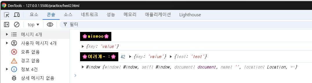 console.log("여러개~ :", 42, { key: "value" }, {test:"test"});