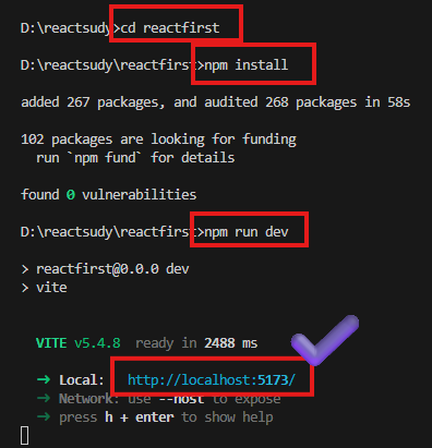 reactfirst 디렉토리가 자동으로 생성되고 그 안에 여러가지 필요한 파일들이 자동으로 생성.