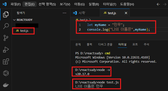 Terminal에 node test.js 라 입력.