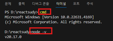 node -v 를 쳐보자. 버젼이 표시가 되어야 한다. 만약 안 된다면 vscode를 다시 실행