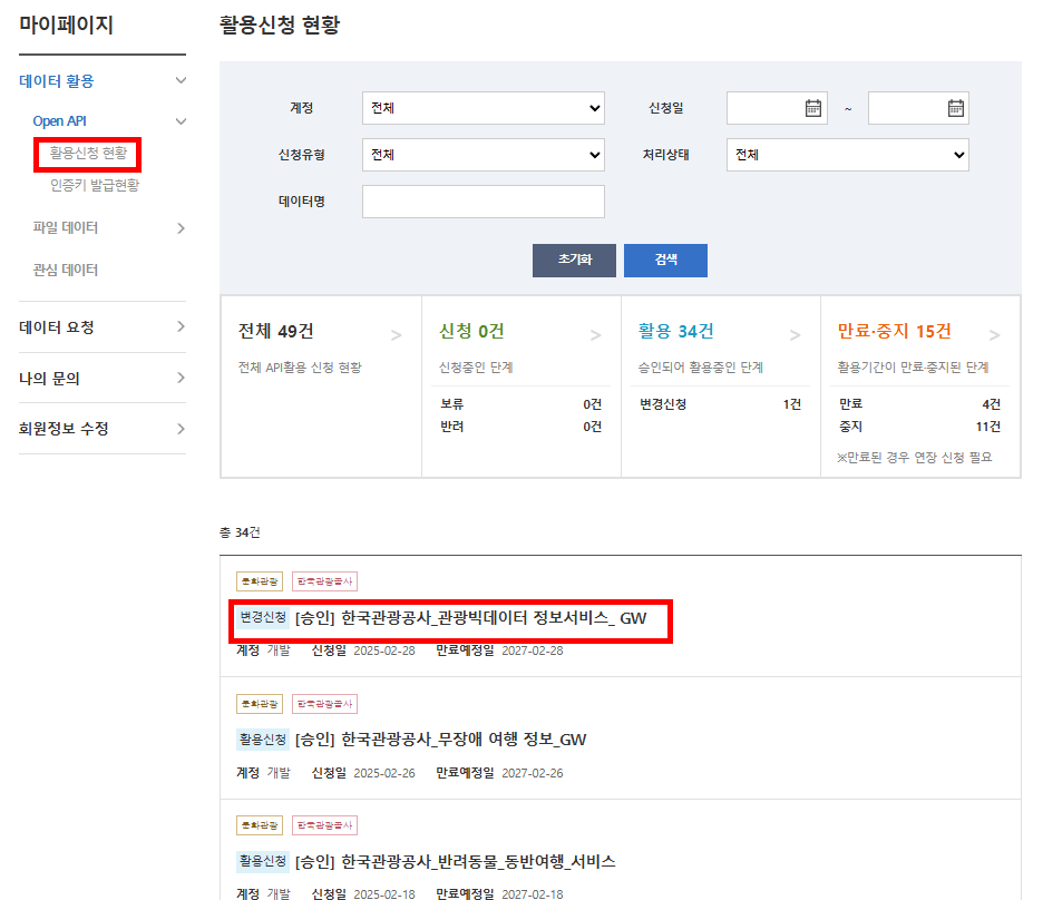 마이페이지 -> 데이터 활용 -> Open API -> 활용신청 현황 클릭